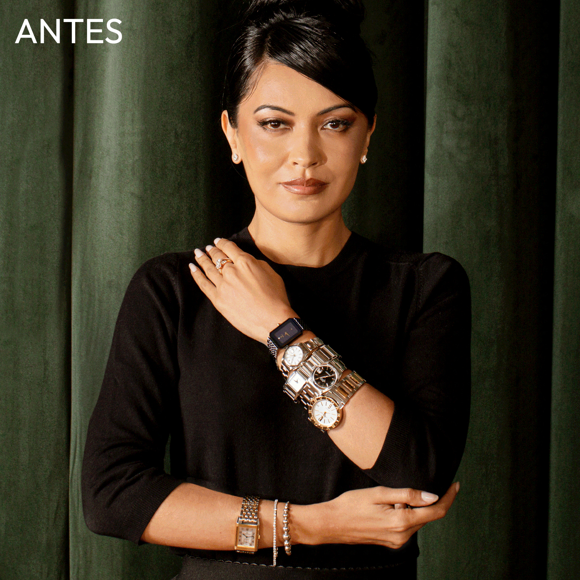 Before defining the visual aesthetic, I conducted a benchmark analysis to understand how premium and luxury brands behave during seasonal sales. We noticed an almost complete absence of text overlays on Instagram feeds (the brand's main showcase beyond the website), even during Black Friday. Therefore, we opted for a minimalist and elegant photoshoot, with the model dressed in black to ensure the jewelry stood out.