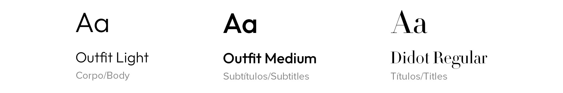 Para os elementos de design, mantivemos todas a tipografia da marca para corpo, subtítulo e título. Outfit é a fonte escolhida para o corpo e subtítulo, alternando apenas entre os pesos para dar destaque em uma palavra ou criar uma hierarquia. Já para os títulos, Didot Regular é a fonte que usamos em nossa comunicação, ficando exclusiva no KV (Key Visual) para essa sazonalidade.